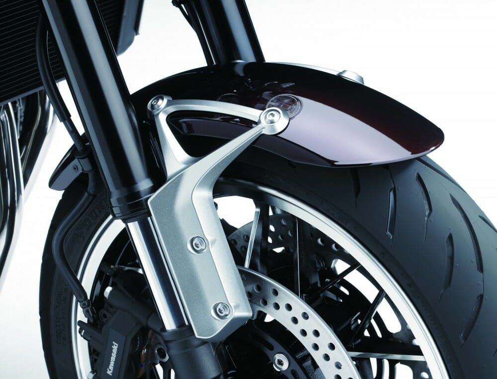 The cast aluminum wheels were chosen for the Z900RS feature flat spokes designed to look like classic wire-spoked wheels. Designed using Kawasaki’s advanced analysis technology, the wheels offer a balance of lightweight and stylish looks, contributing to both handling and a design suited to the retro category.