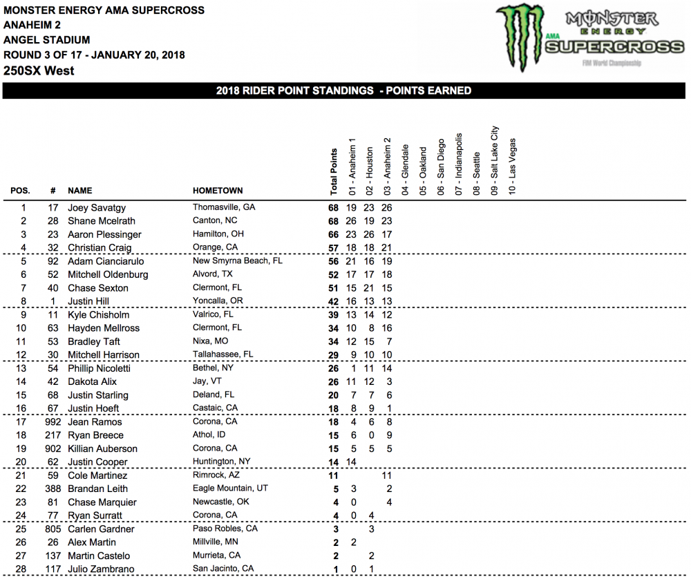 2018 Anaheim 2 250cc Supercross Results: Monster Energy/Pro Circuit Kawasaki’s Joey Savatgy has been steadily improving throughout the first three rounds of the Monster Energy/AMA 250cc Western Regional Supercross Championship, and after leading much of the main event a week ago in Houston, he came out swinging at the first of three (two for the West) Triple Crown events.
