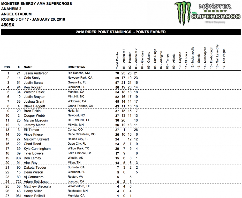 Anderson now leads the points standings by 11 points over Seely, while Musquin now sits 11th in points and Tomac sits 13th with 14 rounds left to run. The series heads to Glendale, Arizona, next Saturday night, where Tomac dominated in 2017.
