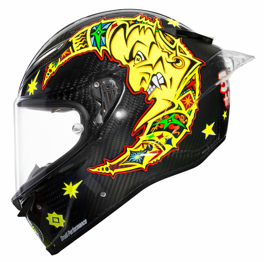 The historic graphic has been given a modern twist. The AGV graphic designers and Drudi have updated the background colors: it is now the 100-percent carbon-fiber shell that darkens the background on the side that was once painted black, and the yellow is now neon. The specially designed logo celebrating the 20th anniversary of Valentino Rossi’s first world championship title is positioned on the chin guard and puts on a good show.