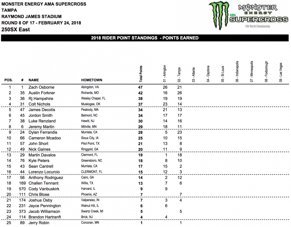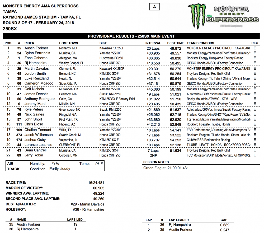 2018 Tampa 250cc Supercross Results: Monster Energy/Pro Circuit Kawasaki’s Austin Forkner had a banner day in Tampa. He started the day qualifying a close second behind Monster Energy/Yamalube Star Racing Yamaha’s Dylan Ferrandis, then took advantage of a mistake by race leader RJ Hampshire (GEICO Honda) to take the lead on his way to his first-ever supercross win.