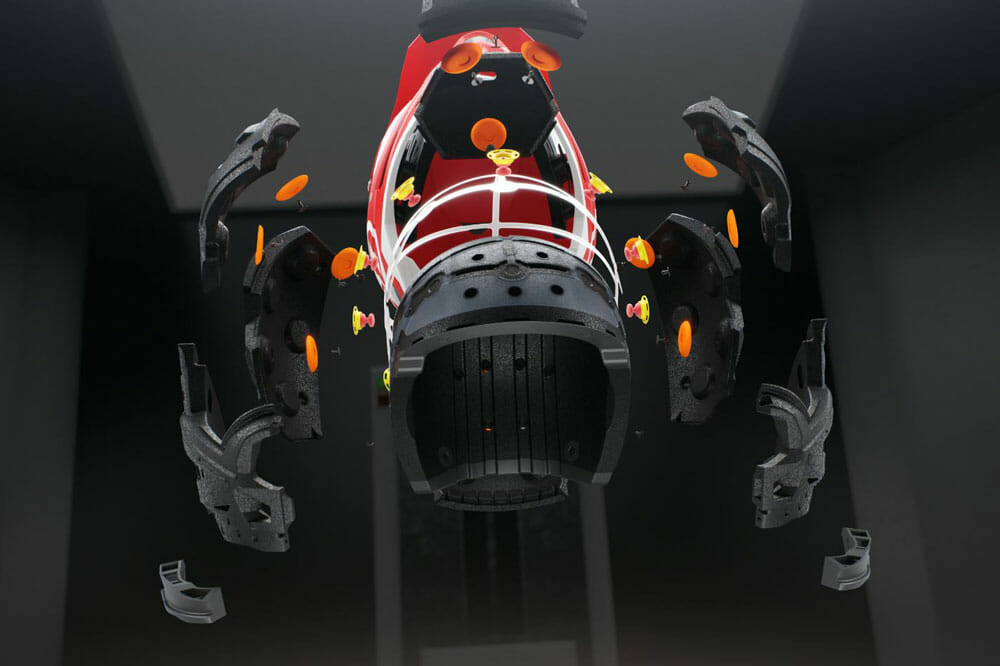 The ATR-2’s Advanced ODS is highlighted by a new Expanded Polypropylene (EPP) multi-impact outer liner and a new Expanded Polystyrene (EPS) replaceable inner liner. As before, the two liners are connected via a series of elastomeric isolation dampers, assisting in progressive loading of the ODS system during impacts. Now, however, many of those dampers have been replaced by damping towers that are incorporated into only the outer liner; these towers are capped by new, low-friction disks that slide freely against the inner liner, thereby reducing friction under loading and increasing the displacement travel between the two liners.