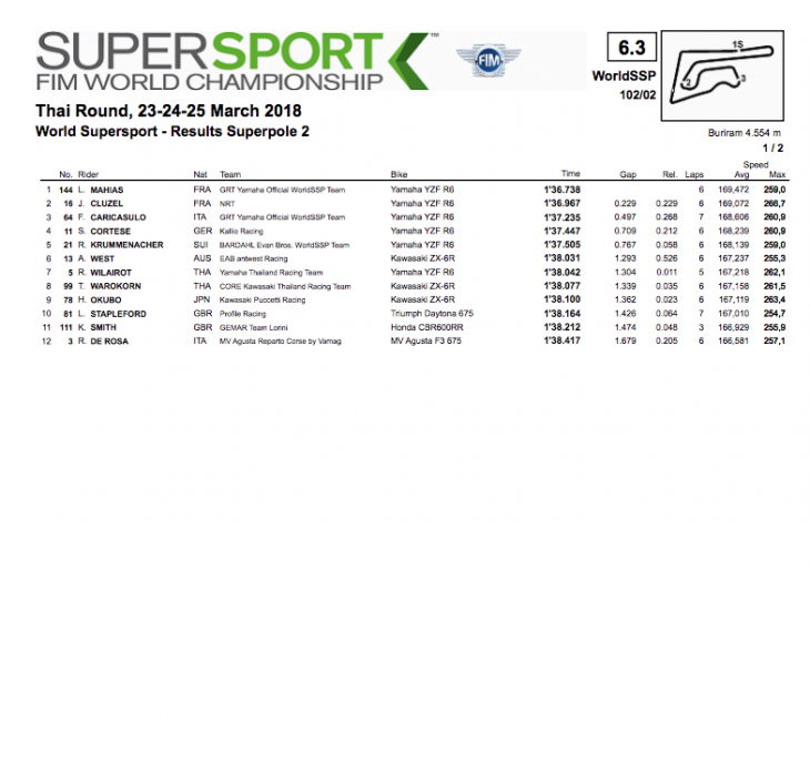 Local riders got into the act in Superpole, with Ratthapong Wilairot (Yamaha Thailand Racing Team) seventh and Thitipong Warokorn (Core Kawasaki Thailand Racing Team) eighth.