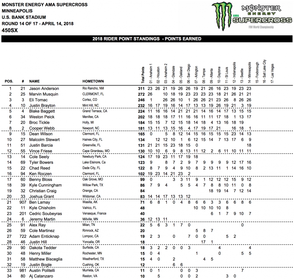Anderson now leads the title chase by 39 points with only three rounds left to run, with Musquin second and Tomac third, 26 points behind Musquin.
