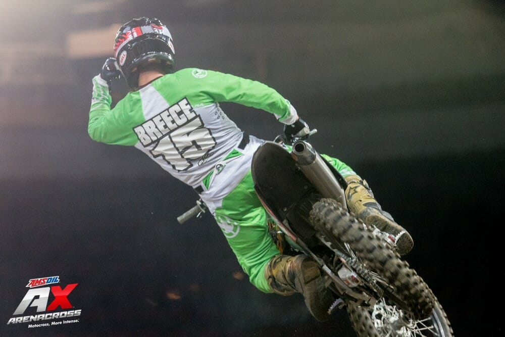 Wichita AMSOIL Arenacross Results 2018 – Jacob Hayes (Team Babbitt’s Monster Energy Kawasaki) came away with the overall win at the AMSOIL Arenacross round at INTRUST Bank Arena in Wichita, Kansas, April 7. Hayes and Chris Blose (Rockford Fosgate TiLube Honda) traded wins in the two main events, but it was Hayes topping the all-important tie-breaking second race that landed him the overall victory.