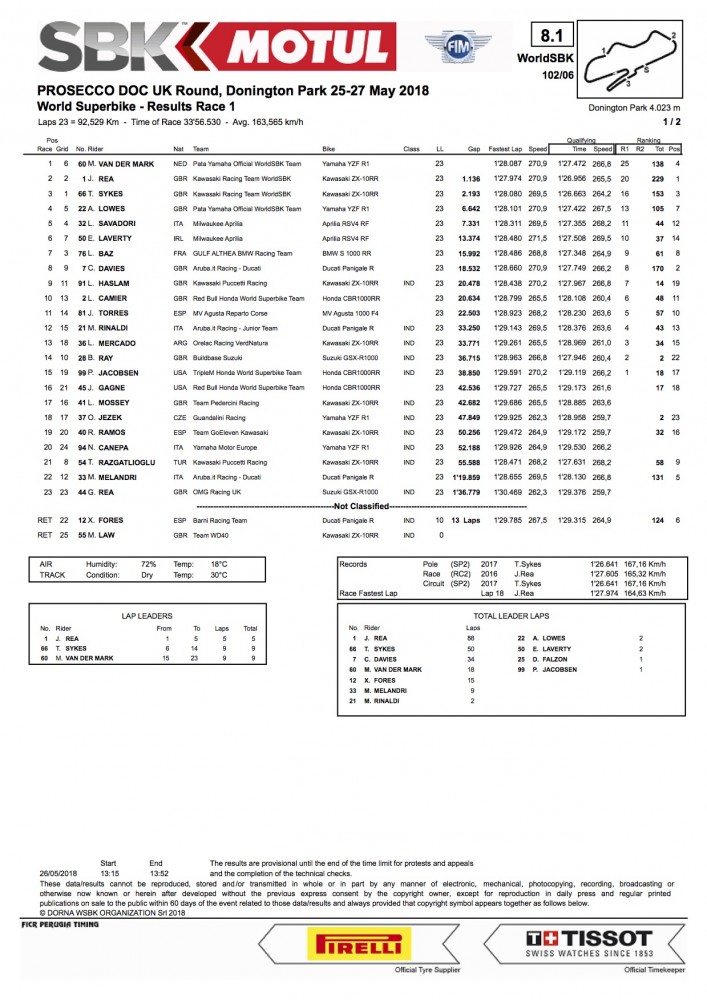 2018 British WorldSBK and WorldSSP Saturday Results—Everyone expected history in race one, but it was Michael van der Mark (Pata Yamaha Official WorldSBK) who scored his first win rather than (Jonathan Rea (Kawasaki Racing Team) becoming a stand-alone all-time race winner in WorldSBK.