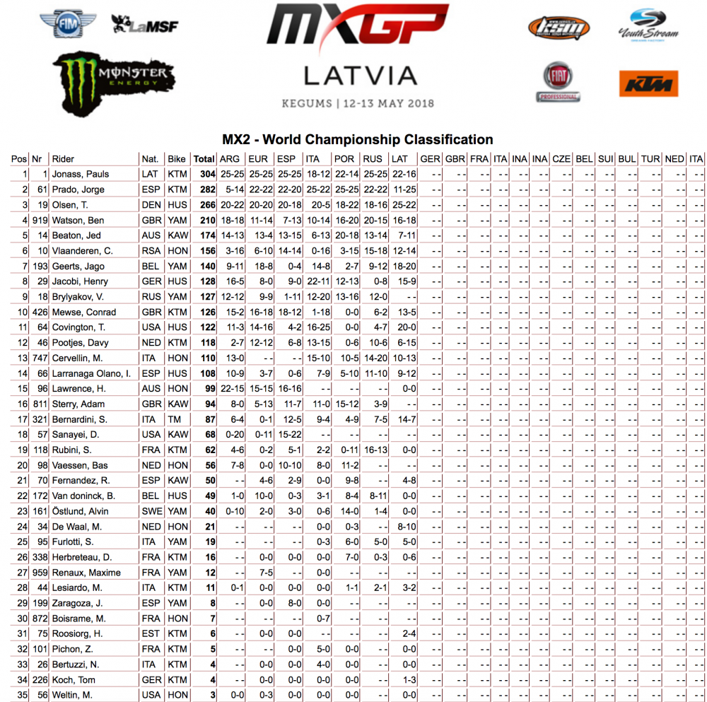 Jonass had a terrible start in the second moto and did all he could to end up fifth at the finish. Olsen took the overall with a 1-2 score over the 4-3 of Belgian Yamaha pilot Jago Geerts and points leader Jonass, whose 2-5 landed him third overall.