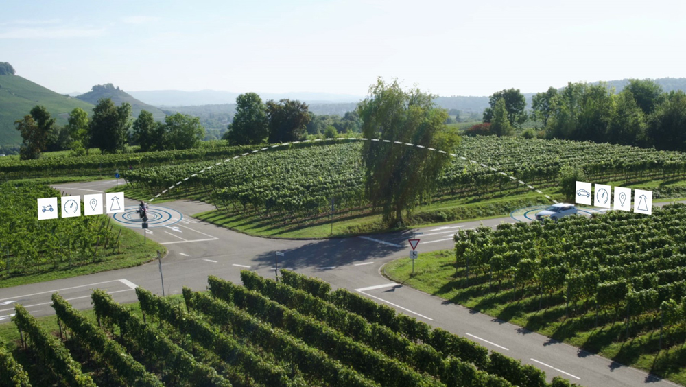 By enabling motorcycles and cars to communicate with each other, Bosch is creating a digital shield for motorcyclists. Up to ten times a second, vehicles within a radius of several hundred meters exchange information about vehicle type, speed, position, and direction of travel. Long before a motorcycle comes into view, this technology warns drivers and the sensors in their vehicles that a motorcycle is approaching. This allows them to drive better and more defensively. The public WLAN standard (ITS G5) is used as the basis for the exchange of data between motorcycles and cars. Transmission times of just a few milliseconds between transmitter and receiver mean that participating road users can generate and transmit important information relating to the traffic situation.