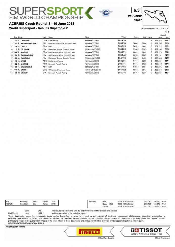 2018 Czech Republic WorldSSP Saturday Results—Sandro Cortese (Kallio Racing Yamaha) make his mark at Brno with the third Superpole win of his short WorldSSP career, taking the best start possible for Sunday’s race.