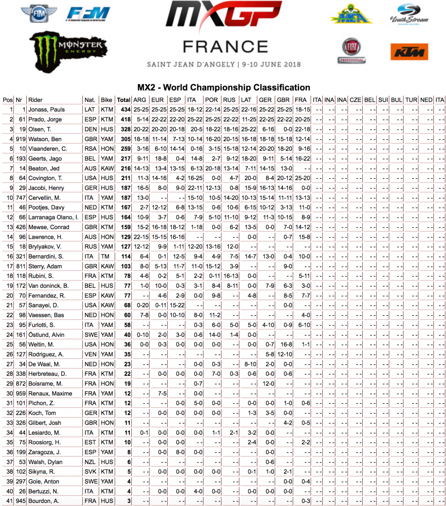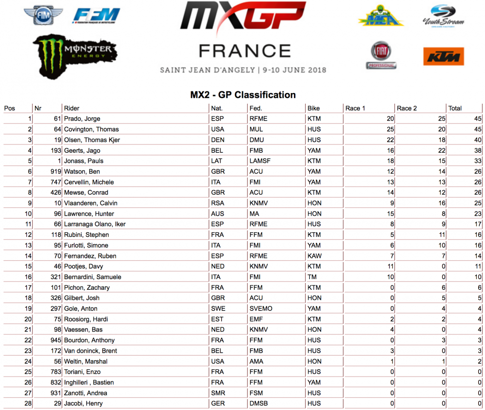 2018 St. Jean d’Angely MX GP Results: There was a downpour of rain in the forecast for the St. Jean d’Angely round of the MX GP World Championships, but it never fully materialized, which was either good or bad depending on how good of a mud rider was being asked. In the MX2 class, American Thomas Covington won the Saturday qualifying race on his Rockstar Energy Husqvarna over defending world champ and points leader Pauls Jonass (Red Bull KTM), and then picked up where he left off in moto one on Sunday, grabbing the holeshot in front of his teammate Thomas Kjer Olsen, Jonass, Henry Jacobi, and the rest of the field. Red Bull KTM’s Jorge Prado rounded the first lap in 8th.