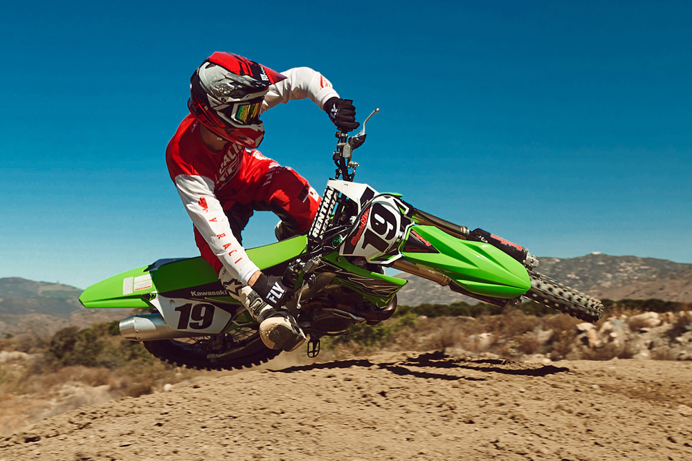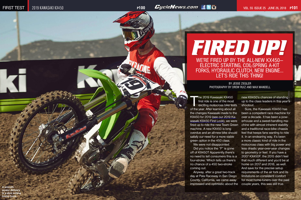 We’re fired up by the all-new KX450—electric starting, coil-spring A-Kit forks, hydraulic clutch, new engine… Let’s ride this thing!