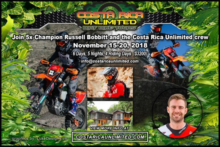 Costa Rica Unlimited is inviting off-road riders to experience the adventure of a lifetime with five-time National Enduro Champion Russell Bobbitt as we ride in, over, and through the beautiful country of Costa Rica.