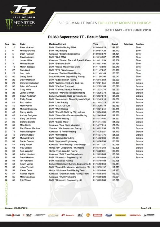 Hickman claims maiden Isle of Man TT win—Peter Hickman (Smiths Racing BMW) claimed his first victory at the Isle of Man TT Races, fueled by Monster Energy, when he took a sensational RL360 Superstock race by 4.4s from Michael Dunlop (MD Racing BMW) with Dean Harrison (Silicone Engineering Kawasaki) in third.