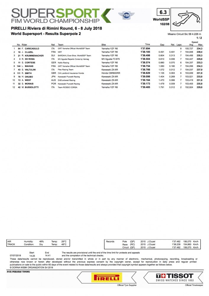2018 Misano WorldSSP Saturday Results