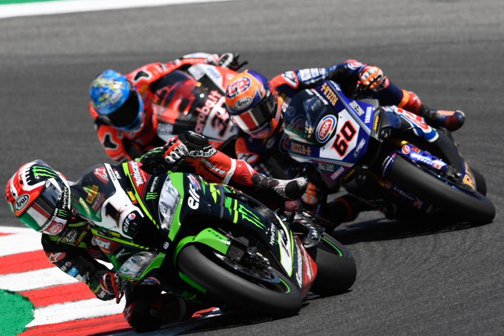 2018 Misano WorldSBK Sunday Results—With the second race reverse grid rules in WorldSBK playing their part again Jonathan Rea (Kawasaki Racing Team) eventually won the second race at Misano, for another double scoring weekend, but he had to work hard for it at times.