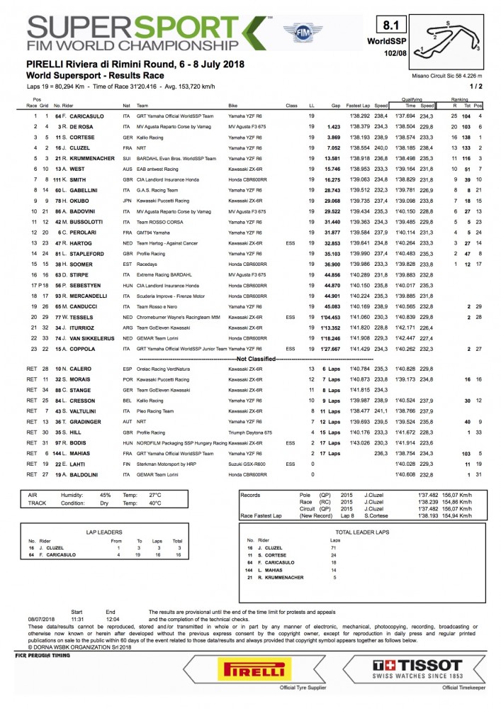 2018 Misano WorldSSP Sunday Results