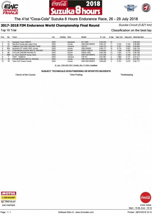 2018 Suzuka 8 Hours Top 10 Qualifying Results