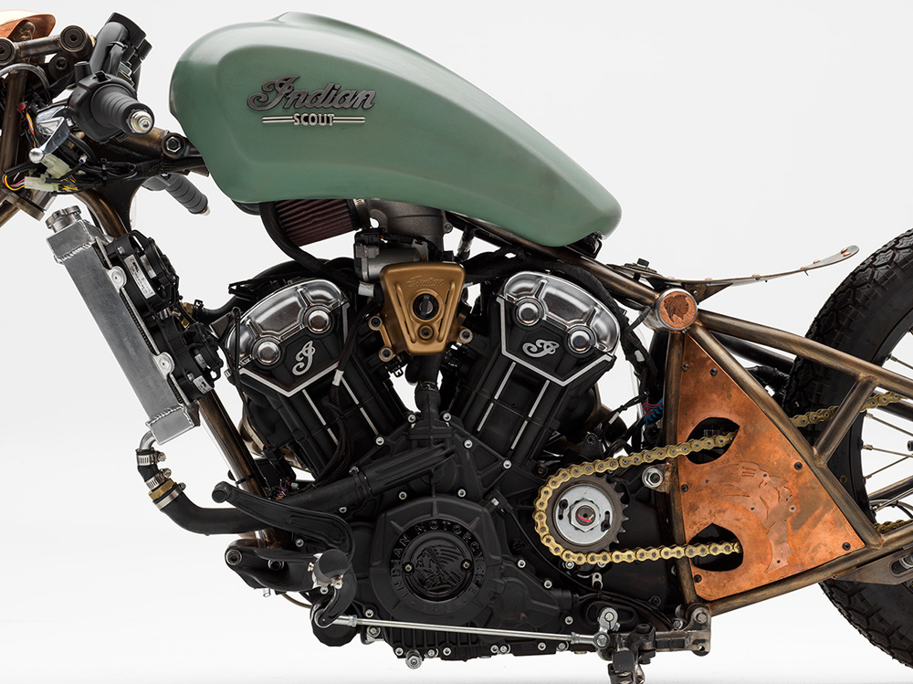 Juarez’s bare-bones chopper, featuring a completely custom hardtail frame, drew inspiration by a number of different mechanical works of art, both in and out of the motorcycle industry. Juarez sites the Indian Scout FTR1200 Custom, RSD Indian Scout custom builds and David Beckham’s garage company, Knuckle, as inspiration.