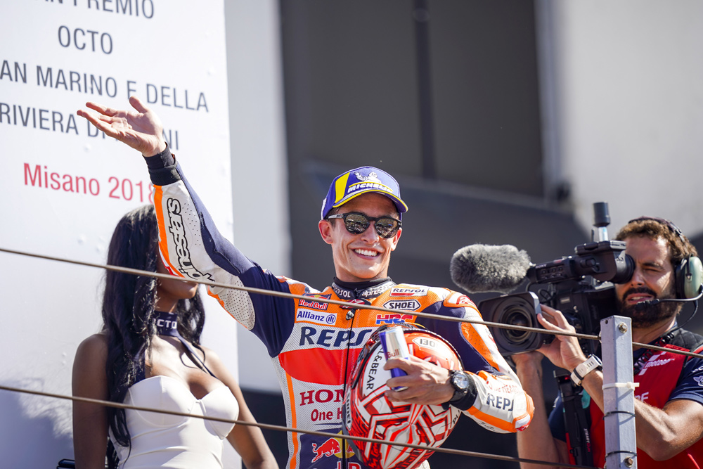 Crossing the San Marino GP finish line in second place ahead of fellow Honda rider Cal Crutchlow, Marc Marquez stepped on the podium for the tenth time this season, and for the sixth time in a row for the first time since 2014.