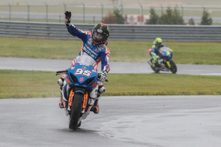 Millville, NJ (Sept. 9, 2018) — News Jersey Motorsports Park was drenched under the remnants of Tropical Storm Gordon, yet in spite of soaking conditions Yoshimura Suzuki Factory Racing’s Roger Hayden and Toni Elias both earned rostrum finishes in Sunday’s MotoAmerica Superbike race two.