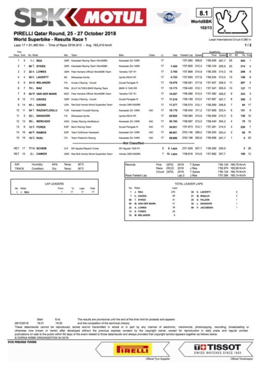 2018 Qatar WorldSBK Race One Results