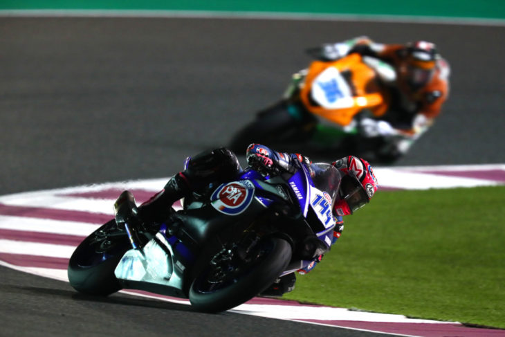 2018 Qatar WorldSSP Race Results—On a track surface that featured fully wet rivers of water on some sectors, after an afternoon sandstorm and then rainstorm of disaster movie proportions, Sandro Cortese (Kallio Racing Yamaha) finally won the WorldSSP championship after a tricky fight with his only rival for the crown, Jules Cluzel (NRT Yamaha).