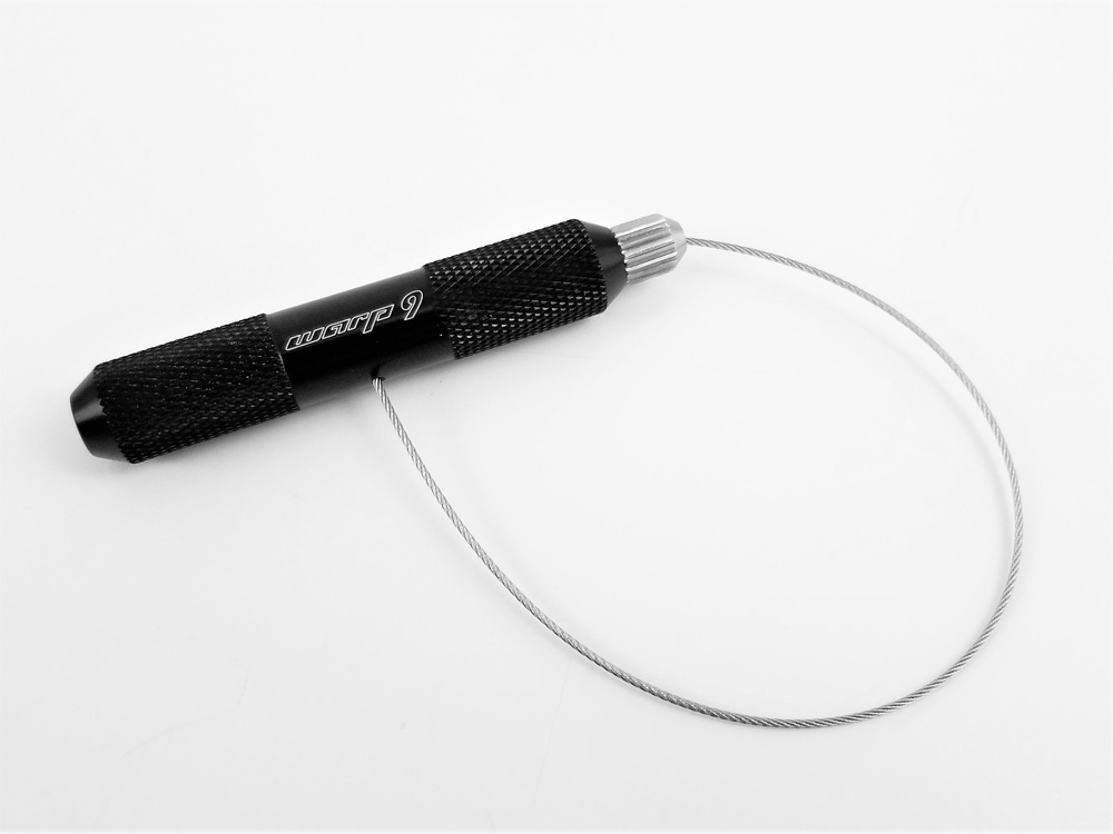 The Warp 9 Valve Stem Puller offers a stronger stainless-steel tip that won’t bend like common brass tips. It has a knurled handle for additional grip during core removal. The core tip threads into the handle to protect it from damage while stowed in a backpack or tankbag. A spare valve core is included.