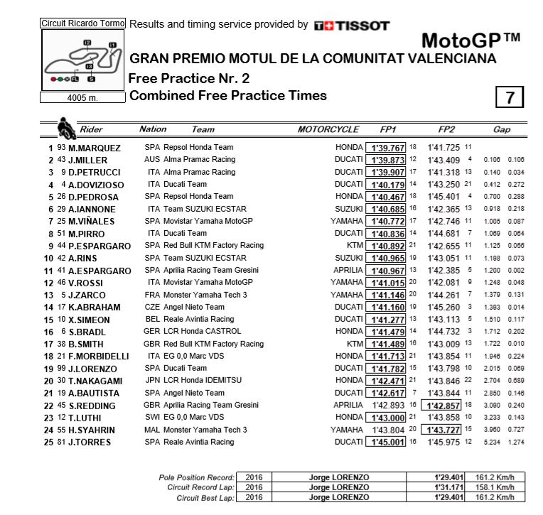 Andrea Iannone, in his last outing on the Ecstar Suzuki, was sixth-fastest; then Maverick Vinales (Movistar Yamaha), Ducati tester Michele Pirro, Red Bull KTM’s Pol Espargaro, and Alex Rins (Ecstar Suzuki) completing the top ten.