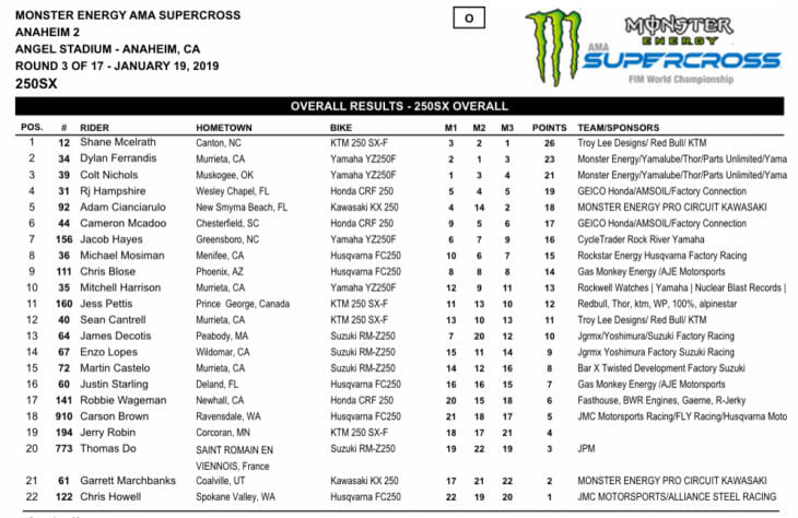 2019 Anaheim 2 Supercross Results 250SX WEST