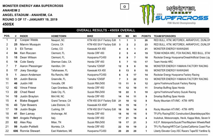 2019 ANAHEIM 2 SUPERCROSS MAIN EVENT RESULTS