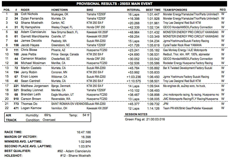 James Decotis (Suzuki), Shane McElrath (KTM) and Colt Nichols (Yamaha) were the top five 250SX West qualifiers. RJ Hampshire (Honda), Michael Moisman (Husqvarna), Chris Blose (Husqvarna), Jacob Hayes (Yamaha) and Enzo Lopes (Suzuki) fills out the top 10.
