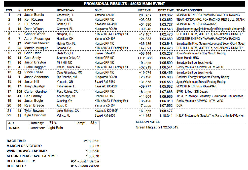 As the race went on, Wilson started having vision troubles while the leaders encountered lapped traffic. Barcia saw his chance and pounced, passing Wilson for the lead on the 14th lap. At the same time, Wilson threw away his goggles and started to fade. Ken Roczen eventually got by Wilson, as did Eli Tomac who passed him for third and the final podium spot on the last lap after getting off to a terrible start. A disappointed Wilson ended up fourth but still had to be happy with such a solid outing.