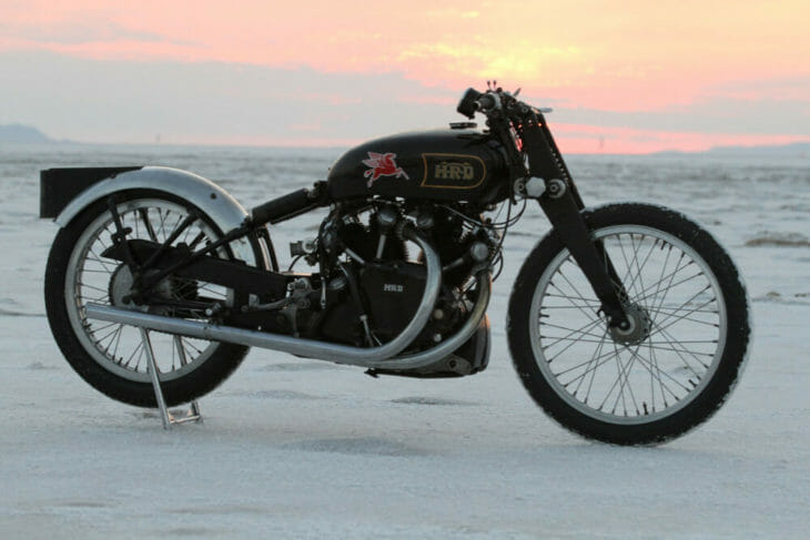 Wealthy sportsman John Edgar, who’d been a hydroplane racer in his younger years, wanted to own the fastest motorcycle in America. He’d met Vincent Motorcycle Company owner Phil Vincent and discussed the possibility of having Vincent prepare a special Vincent HRD that would be set up for speed trials. Vincent agreed and the factory built a special Vincent. Company engineers set the Edgar’s machine up to run on alcohol, included high lift cams, fitted special Amal carburetors and racing tires on Avon alloy rims. After the bike was completed, a factory rider tested the machine at a British airstrip and was able to reach 143 mph before running out of tarmac. That speed alone would be good enough to break the existing record.
