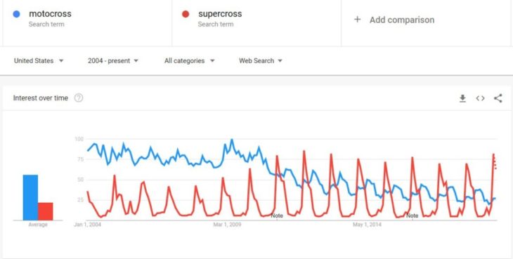 This graph clearly shows the seasonal spikes of the Supercross search phrase. Year after year, every January, Supercross search activity rockets and slowly fades during the racing season and lies practically dormant during summers months. One surprising aspect of Motocross is the fact that the search phrase actually surged during the start of the recession and has fallen since. It also shows a seasonal uptick during summer months. While the search phrase Supercross appears on this graph to be more popular, you see by the average, represented by the bars on the left side of the graph, shows motocross has considerably higher overall search activity.