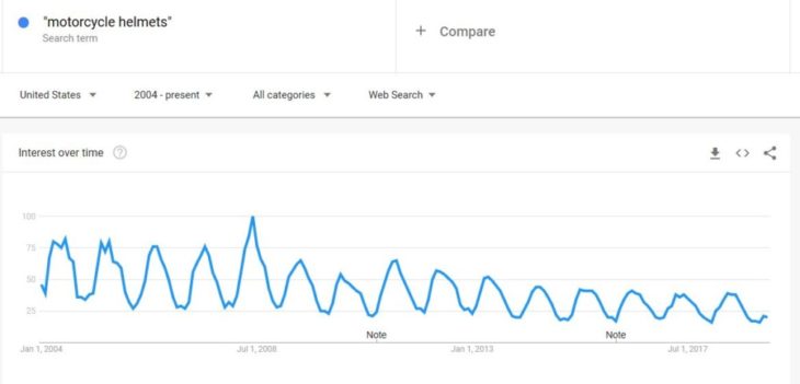 In investing circles there is something called the Men’s Underwear Index, an unconventional economic indicator, which implies a measure of how well the economy is doing can be based on the sales of men’s underwear. I thought a good comparison for motorcycling activity in general, would be something in the same line of thinking – the search phrase “motorcycle helmets”. Like men’s underwear, I theorized that the more people are looking for helmets, the better the health of the industry. As with many other motorcycling categories, you can see a strong seasonal bump in searching for helmets. Discounting the unusually high search spike in June of 2008 (possibly due to a release of a helmet safety study or some other anomaly) the graph shows search for helmets is on a slow decline, at about half of what it was during its peak in the mid-2000s. That lines up well with the U.S. sales of motorcycles, which are about half of what they were in that same time period.