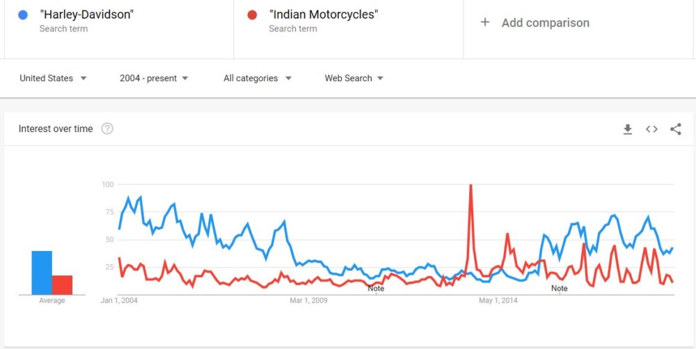 Harley-Davidson is still king when it comes to head to head searches versus Indian Motorcycles, but it’s much closer since Polaris Industries took over Indian in 2013. The massive spike in Indian search came in August of 2013, when the company announced three all-new Indian models. You can see the effects of the recession on Harley-Davidson searches, but the encouraging note for Milwaukee is starting in 2015 the search for the brand has bounced back to almost pre-recession levels.