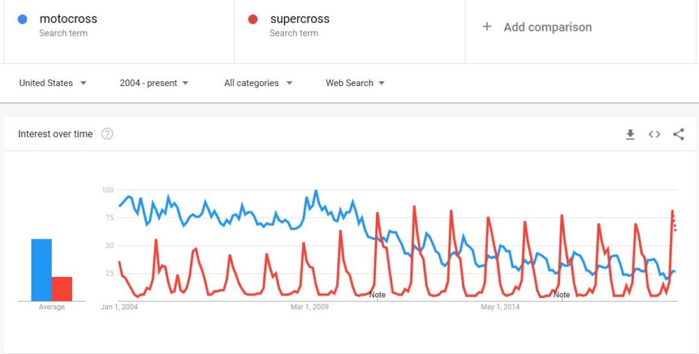This graph clearly shows the seasonal spikes of the Supercross search phrase. Year after year, every January, Supercross search activity rockets and slowly fades during the racing season and lies practically dormant during summers months. One surprising aspect of Motocross is the fact that the search phrase actually surged during the start of the recession and has fallen since. It also shows a seasonal uptick during summer months. While the search phrase Supercross appears on this graph to be more popular, you see by the average, represented by the bars on the left side of the graph, shows motocross has considerably higher overall search activity.