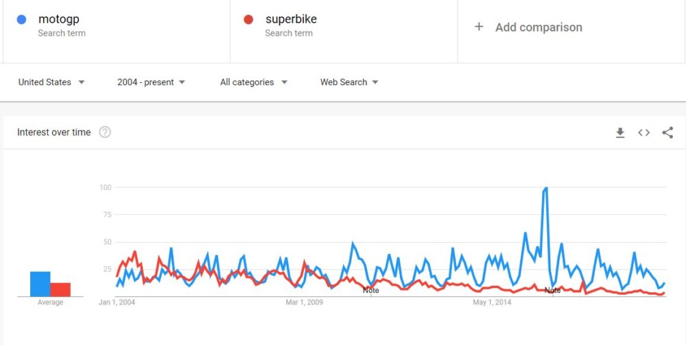 This graph shows U.S. search volume comparing MotoGP (blue line) to the generic phrase Superbike (red line). This shows us the interest in MotoGP has been rising for the last 15 years, while the interest in Superbike has been in a gradual decline.