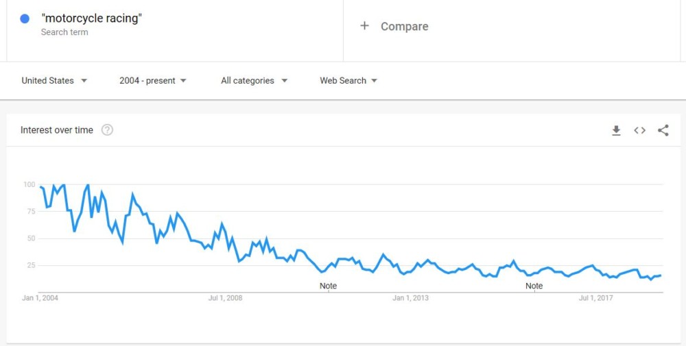 I used the search of the generic phrase “motorcycle racing” to serve as a baseline in the overall interest of the sport in general, regardless of genre. You can easily see from this graph that interest in the last 15 years has fallen quite dramatically. In fact, overall interest in motorcycle racing in less than 20 percent of what it was in its 15-year search peak in 2004.