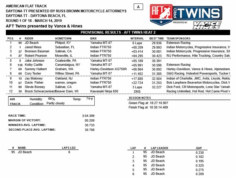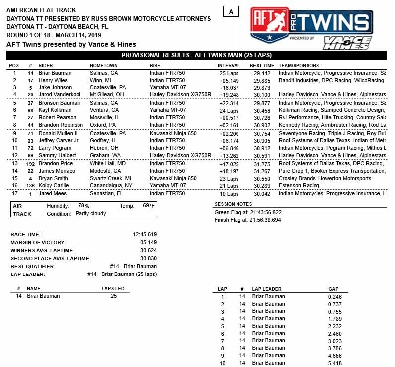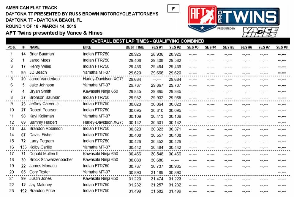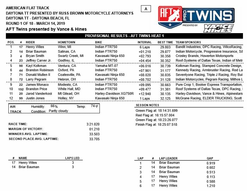 AFT Twins featured two heat events, won by Wiles and JD Beach (Yamaha MT-07). The Twins Semifinals advanced 16 riders to the main event; the two winners were Bauman and Wiles.