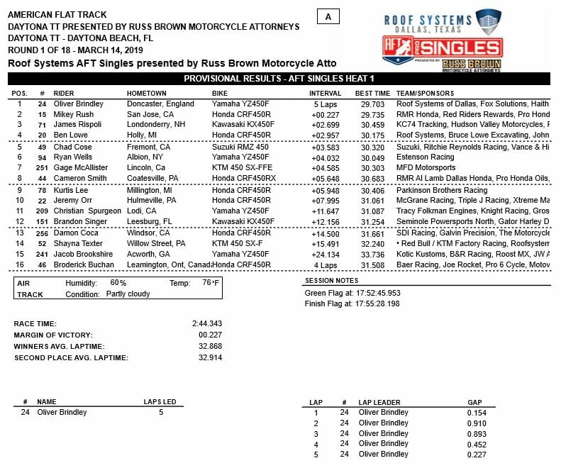 The AFT Singles Heat races opened with British rider Oliver Brindley taking the win in Heat 1 over Mikey Rush. Road racer James Rispoli was third.
