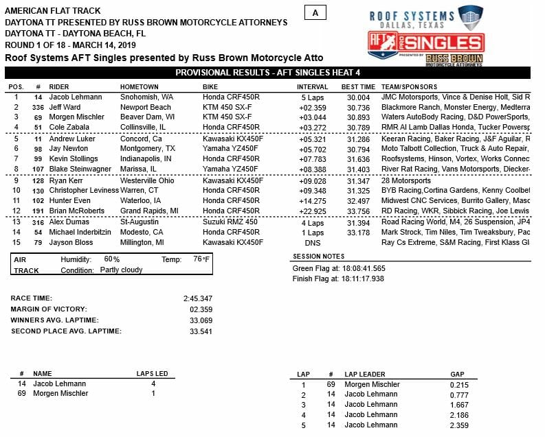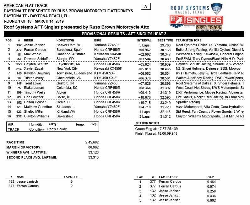 Jessie Janisch of Beaver Dam, Wisconsin was dominant throughout the evening aboard a Yamaha YZ450F in the AFT Singles, winning a heat and a semifinal before also capturing the 15-lap main event. Dalton Gauthier (KTM 450 SX-F) and defending Daytona AFT Singles champion Dan Bromley (KTM 450 SX-F) finished second and third, respectively.
