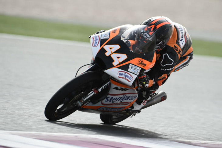 Moto3 opened proceedings, with experience counting for speed, and honours split between Honda and KTM … but only behind the flying Aron Canet, who was fully six tenths ahead of the pack, the rest all up close.