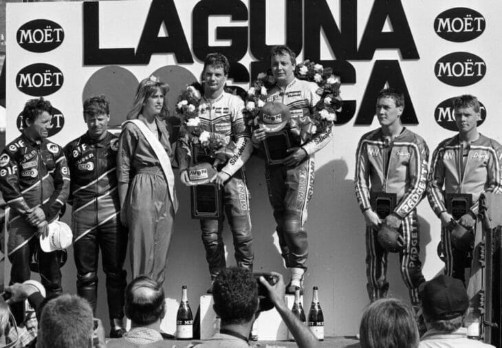 In this week’s Throwback we dial the Wayback Machine 28 years to 1991 and the U.S. Grand Prix at Laguna Seca. Part of the big race weekend was the Sidecar GP event. When it all shook out the podium featured five British participants and one Frenchman. Standing atop the podium are the winners, three-time world champ Steve Webster and his passenger Gavin Simmons. On the left are the Elf Krauser team of Alain Michel (the only non-Brit) and Simon Birchall. Third-place finishers, the Dixon brothers, Darren and Sean, are on the right.