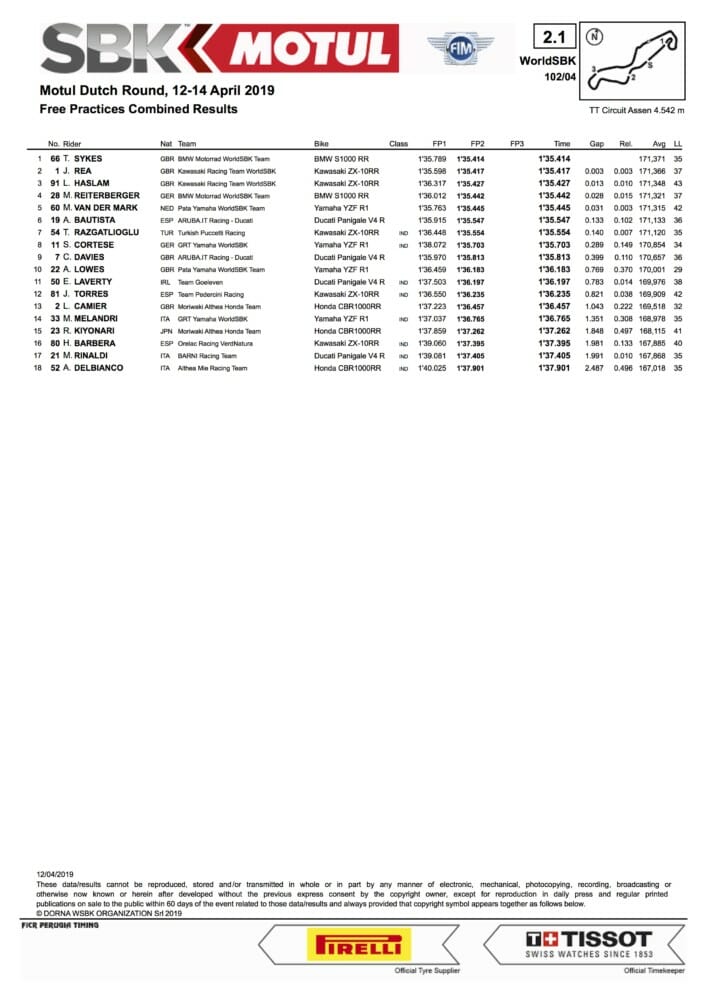 One of those riders to get caught out by the timings was Leon Haslam (Kawasaki Racing Team) in fifth place, and Friday fastest man, Tom Sykes (BMW Motorrad WorldSBK Team) sixth.