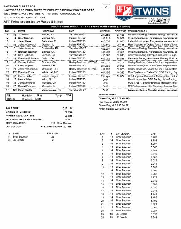 CHANDLER, Ariz. (April 28, 2019) – JD Beach (No. 95 Estenson Racing Yamaha MT-07 DT) pulled off an improbable come-from-behind victory to claim his first-career American Flat Track premier class win in Saturday night’s thrilling Law Tigers Arizona Super TT presented by RideNow Powersports at Wild Horse Pass Motorsports Park in Chandler, Ariz.