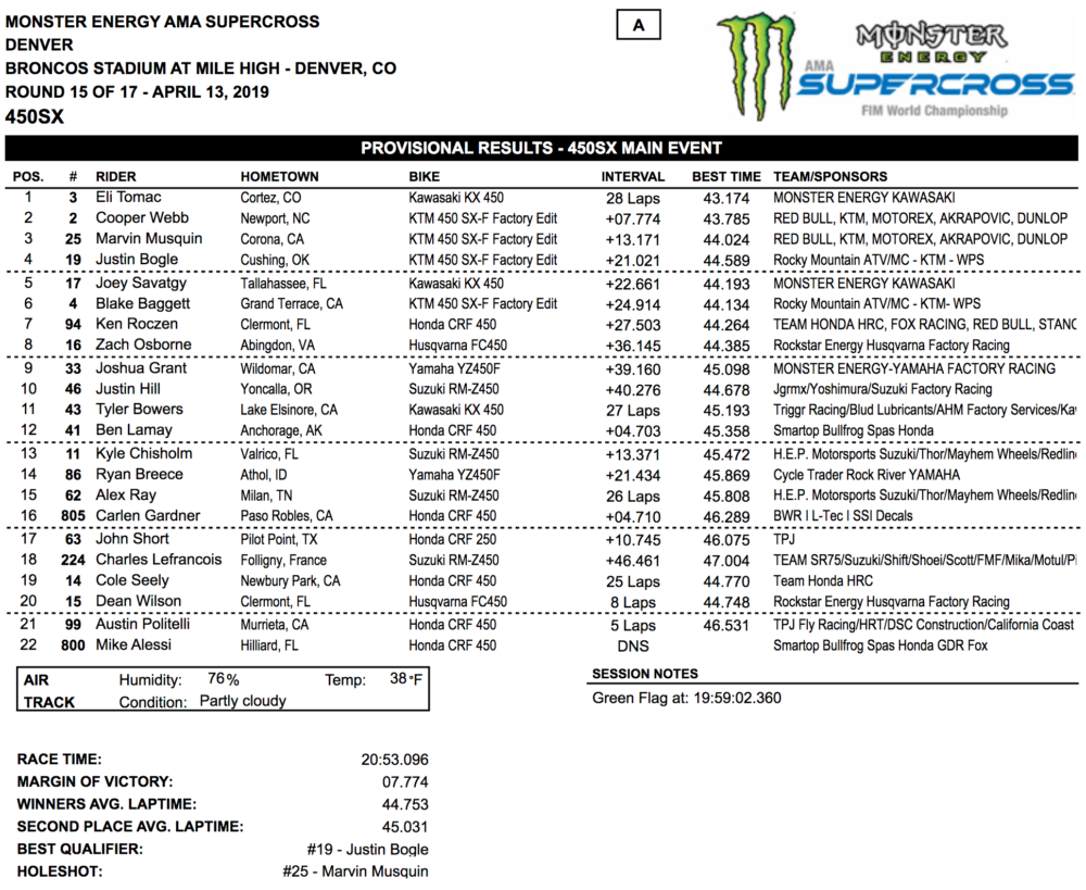 Denver Supercross 450SX Combined Qualifying Results 2019