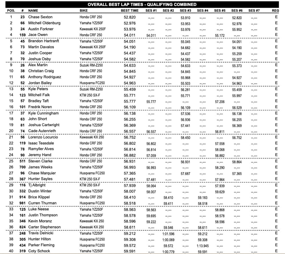 However, the one rider who everyone is keeping a close eye on is points leader Austin Forkner (Monster Energy/Pro Circuit/Kawasaki). He is nursing an injured knee yet still managed an impressive third. He’s almost exactly a second off the pace of the two riders ahead of him.