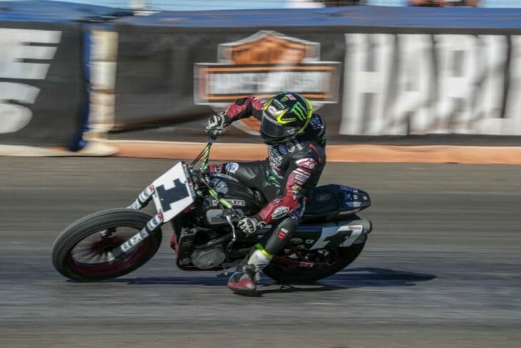 Behind him, Sammy Halbert (No. 69 Harley-Davidson Factory Flat Track Team XG750R Rev X) guided the works H-D to fourth after he tracked down and dispatched a rejuvenated Larry Pegram (No. 72 Indian Motorcycles/Pegram Racing Indian Scout FTR750), who scored a mightily impressive fifth-place finish at the age of 45.