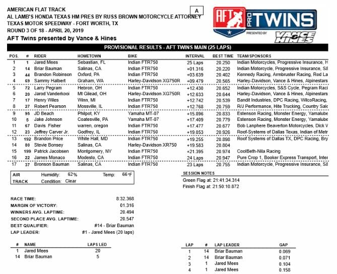 Texas Half-Mile American Flat Track Results 2019 AFT Twins